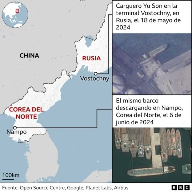 Las imágenes satelitales, compartidas exclusivamente con la BBC, muestran más de una docena de petroleros norcoreanos diferentes que llegaron a una terminal petrolera en el Lejano Oriente de Rusia un total de 43 veces en los últimos ocho meses.