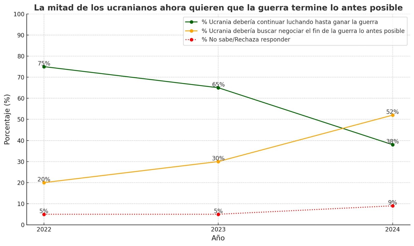 Por esta conjunción de factores crece el número de ucranianos que quiere llegar a un acuerdo que ponga fin a la guerra, algo impensado poco tiempo atrás. Según las últimas encuestas de Gallup realizadas en agosto y octubre de 2024, el 52% de los consultados considera que habría que negociar el fin del conflicto lo antes posible. Sólo el 38% cree en seguir combatiendo hasta alcanzar la victoria. Hace dos años, el 75% de la población quería continuar luchando y solo el 20% apoyaba una salida negociada.
