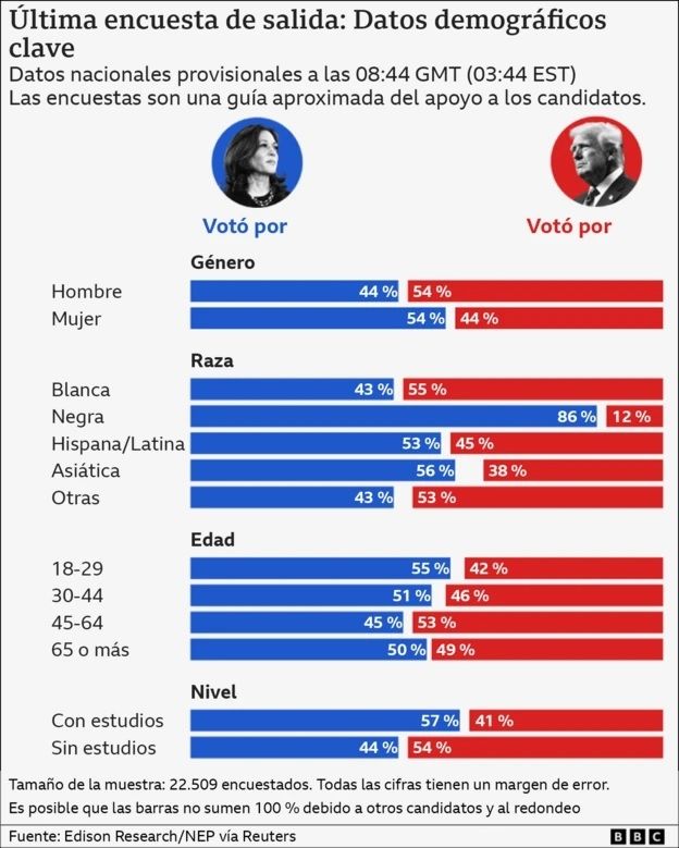 Harris, en cambio, lidera de lejos el voto entre los votantes de raza negra: el 86 % la apoyó.