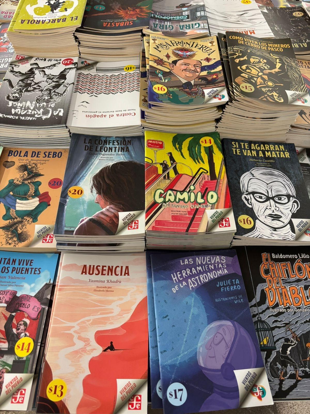 La materialización de su objetivo se dio con la colección Vientos del pueblo, una tirada de autores contemporáneos como Julieta Fierro y clásicos como Alejandro Zambra ilustrados, con tapas a color. Estos llevan un precio notablemente más bajo que los del resto del mercado, van entre los 15 y los 20 pesos mexicanos, que representan 0,75 y un dólar.