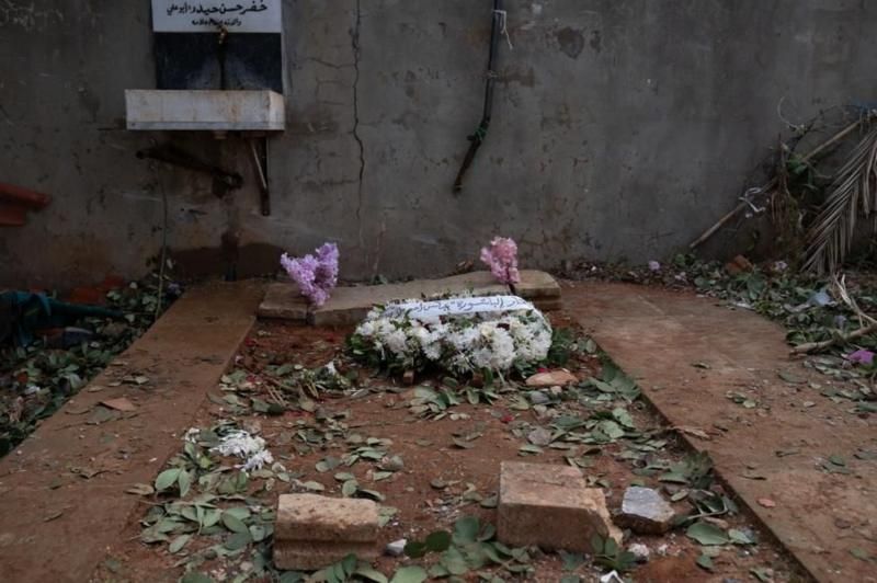 El tío de Rihab colocó dos ramitas de flores de cerezo artificiales encima de la tumba, una para cada niña, y luego alguien más colocó una corona para alguien no identificado enterrado junto a ellas.