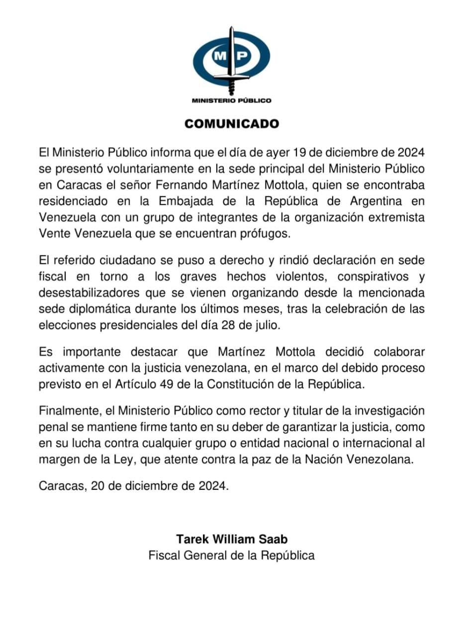 Uno de los seis opositores al régimen de Nicolás Maduro que se encontraba asilado en la embajada argentina en Venezuela abandonó el edificio bajo protección de Brasil y se reunió con su familia. Se trata de Fernando Martínez Mottola, exministro de Transportes y Comunicaciones de Venezuela durante el Gobierno de Carlos Andrés Pérez, quien ahora es acusado de traidor.