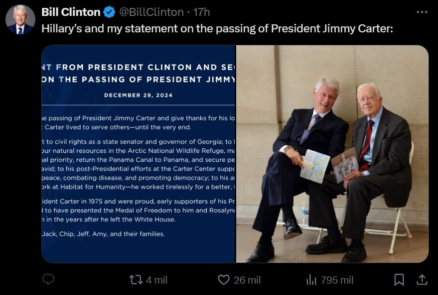 Por su parte, Bill Clinton subió a su cuenta de X una foto junto a Carter, acompañada de un texto en el que aseguraba que tanto él como su esposa Hillary lloraron la partida del expresidente. así como dieron las gracias por su larga vida. "Guiado por su fe, el presidente Carter vivió para servir a otros", manifestó Clinton.
