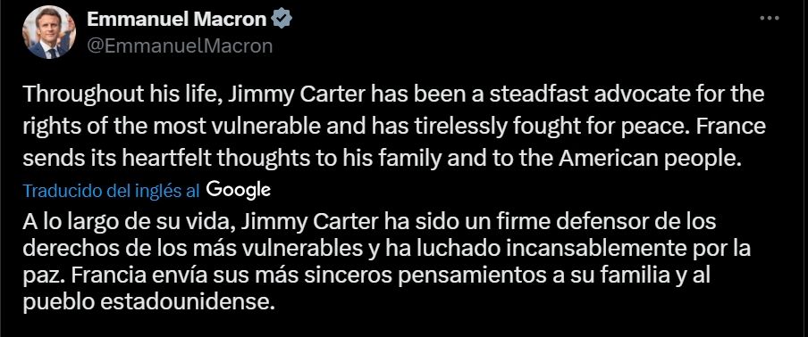 Luego, otros líderes mundiales recordaron a Carter como un defensor de los derechos de los más vulnerables. Este fue el caso del presidente de Francia, Emmanuel Macron, quien expresó: "A lo largo de su vida, Jimmy Carter ha sido un firme defensor de los derechos de los más vulnerables y ha luchado incansablemente por la paz. Francia envía sus más sinceros pensamientos a su familia y al pueblo estadounidense".