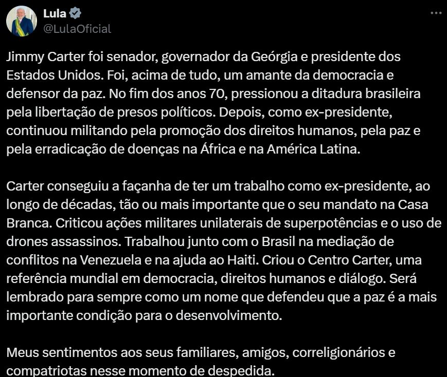 Líderes latinoamericanos como el presidente brasileño Lula Da Silva, resaltaron que Carter fue "un amante de la democracia y defensor de la paz". "A finales de los años 70 presionó a la dictadura brasileña para la liberación de los presos políticos. Posteriormente, como expresidente, continuó haciendo campaña por la promoción de los derechos humanos, la paz y la erradicación de enfermedades en África y América Latina. Trabajó junto con Brasil en la mediación de conflictos en Venezuela y ayudando a Haití. Creó el Centro Carter, referencia mundial en democracia, derechos humanos y diálogo. Siempre será recordado como un nombre que defendió que la paz es la condición más importante para el desarrollo", expuso Da Silva.