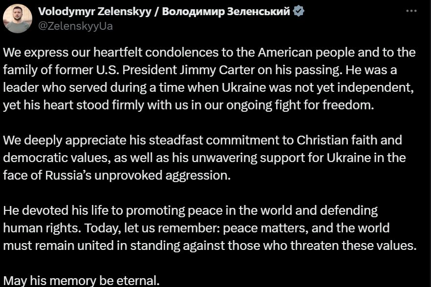 El presidente ucraniano, Volodymyr Zelenskyy, dijo que desde su Gobierno expresaban sus condolencias a la familia del expresidente, resaltando que el líder que acompañó a la lucha de Ucrania por su independencia. "Fue un líder que sirvió en una época en la que Ucrania aún no era independiente, pero su corazón nos acompañó en nuestra lucha constante por la libertad. Apreciamos profundamente su firme compromiso con la fe cristiana y los valores democráticos, así como su inquebrantable apoyo a Ucrania frente a la agresión no provocada de Rusia", declaró.