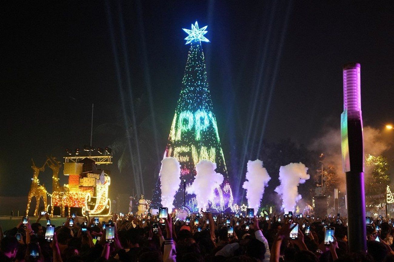 Miles de teléfonos se alzaron exactamente al llegar la medianoche para filmar al árbol de Navidad gigante iluminado con las palabras "Feliz Año Nuevo" en Mumbai, en la India.
