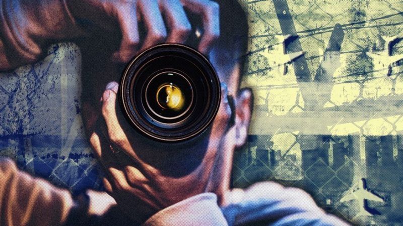 Un hombre, al que llamamos Agente Uno, toma fotos agachado entre unos arbustos.
