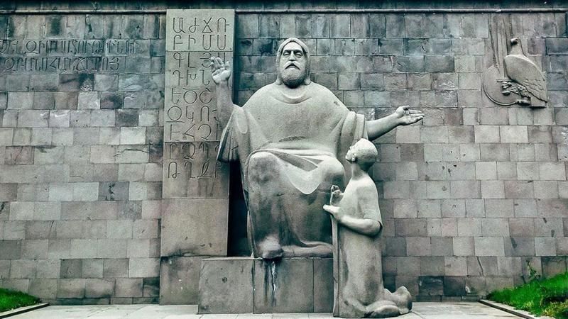 La estatua de piedra inmaculadamente tallada de Mashtots se encontraba en la entrada, con las manos levantadas en la postura eterna de un maestro que aclara un punto a su discípulo (una estatua de piedra más pequeña) que escucha atentamente a sus pies.