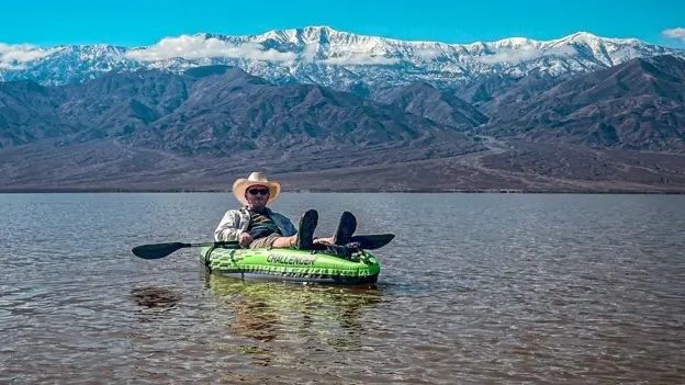 Con las constantes lluvias que empapan la zona, el lago ha crecido hasta tener 30 centímetros de profundidad, lo que significa que hay agua suficiente para practicar una actividad que suena curiosamente fuera de lugar en el famoso paisaje reseco del Valle de la Muerte: kayak.