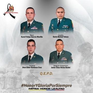 Los cuatro fallecidos son el mayor Karol Felipe García, quien piloteaba la aeronave, el capitán Darío Bernal, el teniente Jhon Barbosa y el sargento Javier Reino, precisó el general Luis Ospina, comandante del ejército de Colombia, en la red social X.
