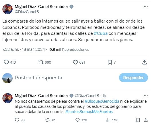 Mientras que en otra publicación, el presidente cubano aseguró que "la comparsa de los infames quiso salir ayer a bailar con el dolor de los cubanos. Políticos mediocres y terroristas en redes, se alinearon desde el sur de la Florida, para calentar las calles de #Cuba con mensajes injerencistas y convocatorias al caos. Se quedaron con las ganas".
