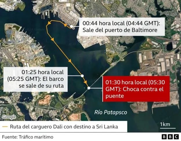 Tras salir del puerto de Baltimore a las 00:44, hora local (05:30 GMT), el carguero giró 180 grados en las aguas de la bahía que forma la desembocadura del río Patapsco para dirigirse a mar abierto.