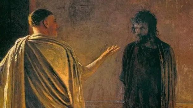 "Le preguntó Pilato: '¿Qué es la verdad?'. Habiendo dicho esto, volvió a los judíos y les dijo: 'No encuentro en él ningún crimen'", también aparece en el evangelio de Juan.