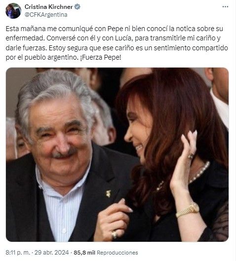 La dirigente, que reapareció en la escena política el último fin de semana en un acto en Quilmes, le deseó una buena recuperación al referente latinoamericano. "Estoy segura que ese cariño es un sentimiento compartido por el pueblo argentino. ¡Fuerza Pepe!", cerró su mensaje.