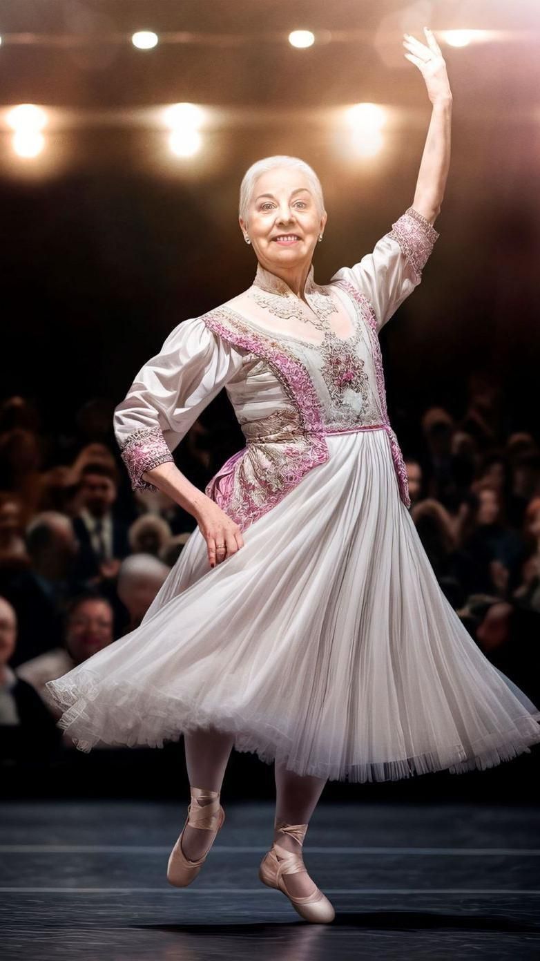 La imagen la muestra celebrando su 60 cumpleaños, actuando con su compañía de danza amateur Chelsea Ballet, mientras su esposo desde hace 30 años, Barry, la mira orgulloso.