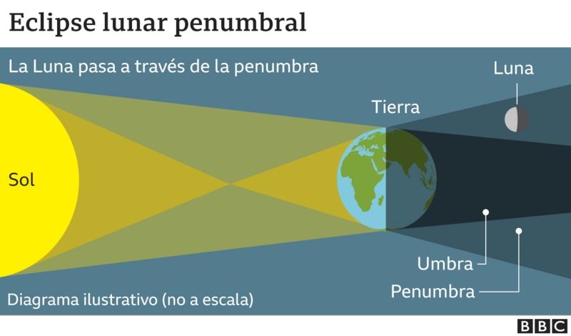 El eclipse lunar penumbral ocurre cuando la Luna pasa a través de la sombra penumbral de la Tierra, es decir, una sombra mucho más tenue.