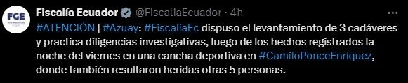 El hecho ocurrió en la provincia andina del Azuay (sur) y la Fiscalía ha dispuesto ya el levantamiento de tres cadáveres, y practica diligencias de investigación.