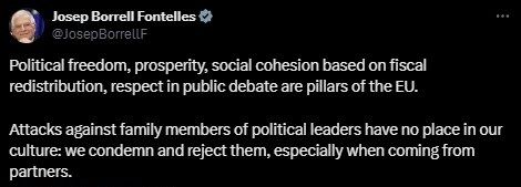 ”Los ataques contra familiares de líderes políticos no tienen cabida en nuestra cultura: los condenamos y rechazamos, especialmente cuando provienen de nuestros socios”, escribió el Alto Representante para Política Exterior de la Unión Europea, Josep Borrell, en su cuenta de X.