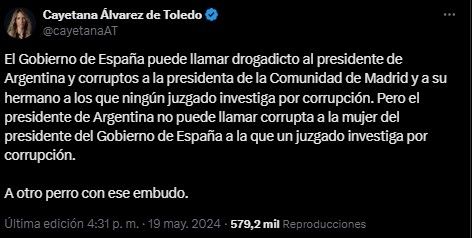 "El Gobierno de España puede llamar drogadicto al presidente de Argentina y corruptos a la presidenta de la Comunidad de Madrid y a su hermano a los que ningún juzgado investiga por corrupción. Pero el presidente de Argentina no puede llamar corrupta a la mujer del presidente del Gobierno de España a la que un juzgado investiga por corrupción", disparó la legisladora.
