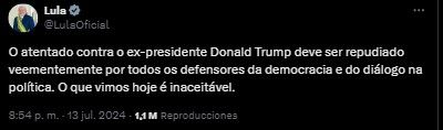 El presidente de Brasil, Luiz Inácio Lula da Silva, pidió que el hecho sea repudiado "vehementemente por todos los defensores de la democracia y del diálogo en la política”. "Lo que vimos hoy es inaceptable", señaló.