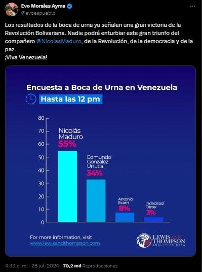 "Los resultados de la boca de urna ya señalan una gran victoria de la Revolución Bolivariana. Nadie podrá enturbiar este gran triunfo del compañero @NicolasMaduro, de la Revolución, de la democracia y de la paz. ¡Viva Venezuela!!", escribió Morales, quien adjunto la encuesta falta.