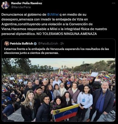 Su posteo fue en respuesta a otra publicación, en este caso de la ministra de Seguridad, Patricia Bullrich, en el que confirmaba su presencia "junto a cientos de personas" en las inmediaciones de la Embajada venezolana, para esperar los resultados de los comicios presidenciales de Venezuela.