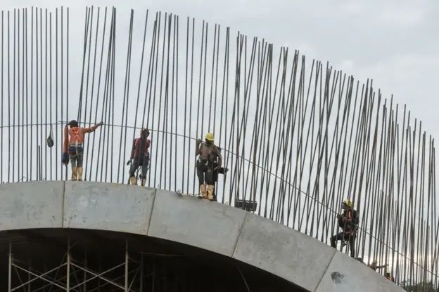 Cuando la BBC visitó recientemente el lugar, cientos, si no miles, de empleados trabajaban sin parar, apresurándose para avanzar en la construcción de edificios inacabados, mientras camiones y excavadoras levantaban nubes de polvo a lo largo del accidentado camino.