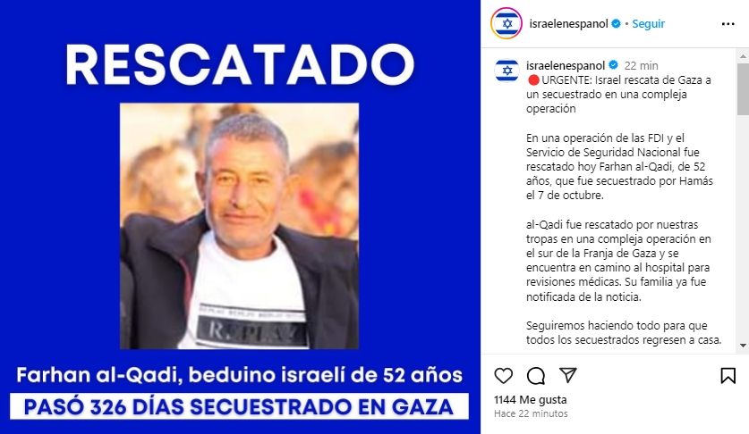El Ejército israelí rescató este martes al rehén Qaid Farhan Kadi, un beduino de 52 años, en el sur de la Franja de Gaza, donde permanecía secuestrado por Hamás desde el pasado 7 de octubre.