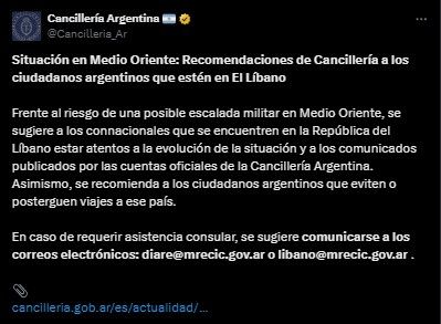 Al respecto, la Cancillería emitió este sábado un comunicado para llamar a evitar viajes a Medio Oriente. "Frente al riesgo de una posible escalada militar en Medio Oriente, se sugiere a los connacionales que se encuentren en la República del Líbano estar atentos a la evolución de la situación y a los comunicados publicados por las cuentas oficiales de la Cancillería Argentina", señaló