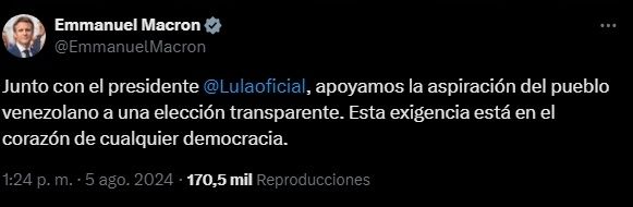 A su vez, Emmanuel Macron, se expreso vía X y dijo, en español, lo siguiente: "Junto con el presidente @Lulaoficial [Lula], apoyamos la aspiración del pueblo venezolano a una elección transparente. Esta exigencia está en el corazón de cualquier democracia".