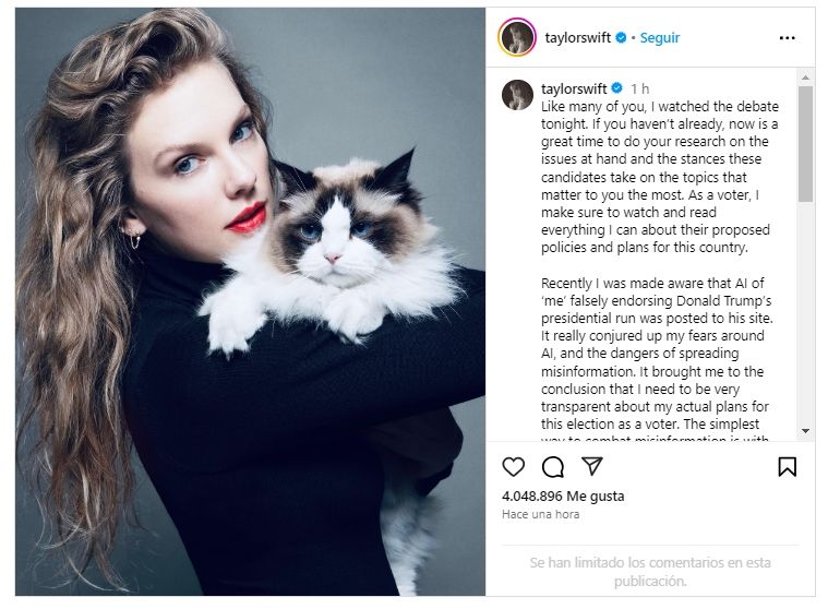En su publicación, explicó que quería esperar a ver a los dos candidatos en el debate y reveló que la decisión de posicionarse se produjo después de que supiera que Donald Trump había utilizado en julio imágenes generadas por inteligencia artificial para decir de manera falsa que había logrado el apoyo de la cantante.
