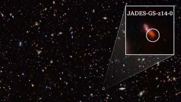 Pie de foto,Galaxias primarias, como la JADES-GS-z14-0, están aportando información novedosa sobre la formación del universo. Se espera que los puntos rojos también lo hagan.
