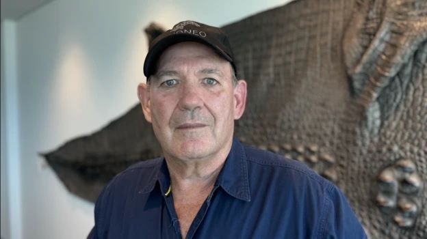 Su oficina está en el centro de Darwin. Extendida por el suelo hay una enorme piel de cocodrilo. En la pared de la sala de conferencias hay otra piel que se extiende al menos cuatro metros.