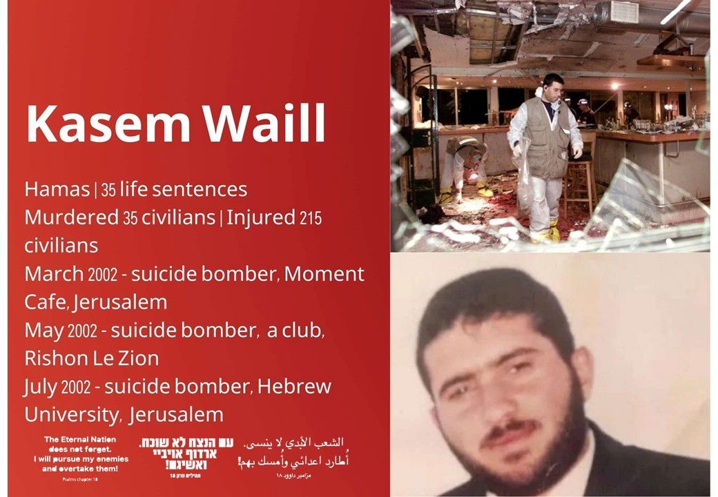 Entre los prisioneros palestinos liberados figura Kasem Waill, quien cumplía 35 cadenas perpetuas por asesinar a 35 civiles y herir a otros 215 en tres atentados con bombas. Estos ataques terroristas incluyeron el Moment Café en Jerusalén, un club nocturno en Rishon Letzion y la Universidad Hebrea de Jerusalén. Hoy fue liberado como parte del acuerdo para la liberación de los secuestrados.