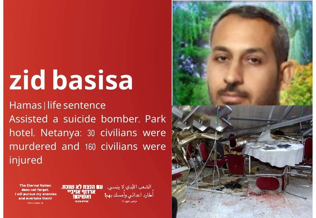 También quedará en libertad Zid Basisa, condenado a cadena perpetua por el asesinato de 30 civiles y otros 160 heridos en un atentado suicida durante Pesaj en el Hotel Park de Netanya.