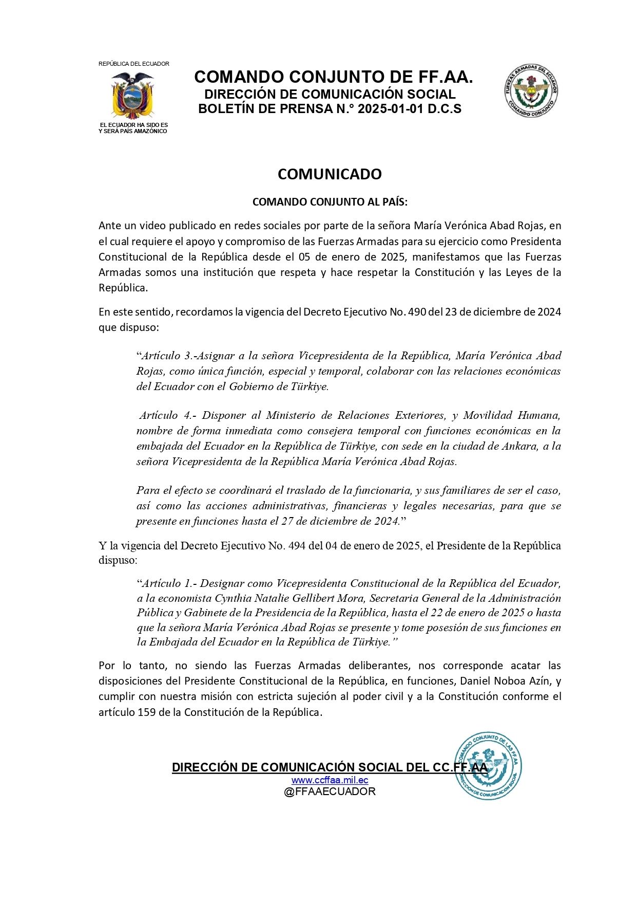 “Ante un video publicado en redes sociales por parte de la señora María Verónica Abad Rojas, en el cual requiere el apoyo y compromiso de las Fuerzas Armadas para su ejercicio como Presidenta Constitucional de la República desde el 5 de enero de 2025, manifestamos que las Fuerzas Armadas somos una institución que respeta y hace respetar la Constitución y las Leyes de la República”, inicia el comunicado.