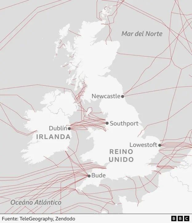 El Reino Unido tiene cerca de 60 cables que llegan a tierra en distintos puntos de su costa, con una particular concentración en el este y suroeste de la isla.