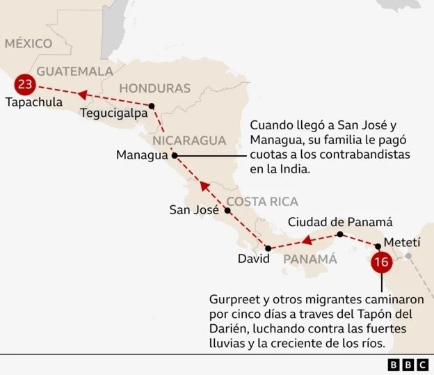 Gurpreet anota que ellos esperaron por cerca de un mes en México hasta que hubo una oportunidad de cruzar la frontera cerca de San Diego.
