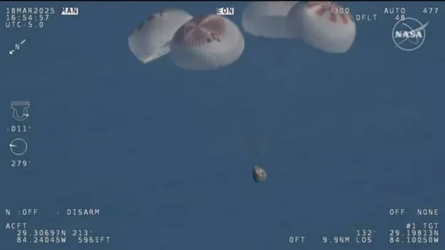 En cuestión de minutos, la cápsula redujo su velocidad de más de 27.000 km/h a estacionaria y amerizó frente a la costa de Florida.