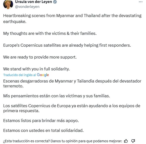 Ursula von der Leyen, presidenta de la Comisión Europea, realizó un comunicado en la red social X en el que aseguró que la Unión Europea está lista para enviar ayuda a los países afectados por el terremoto que se registró en Myanmar. "Los satélites Copernicus de Europa ya están ayudando a los equipos de primera respuesta. Estamos listos para brindar más apoyo", ratificó.