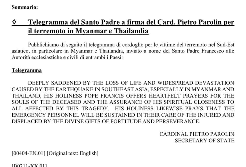 El Sumo Pontífice envió un telegrama expresando sus condolencias a las familias de las víctimas fatales y a los heridos por el terremoto que sacudió al sudeste asiático este viernes. "Rezo por los fallecidos y aseguro mi cercanía a todos los afectados por la tragedia”, sentenció el Papa Francisco.