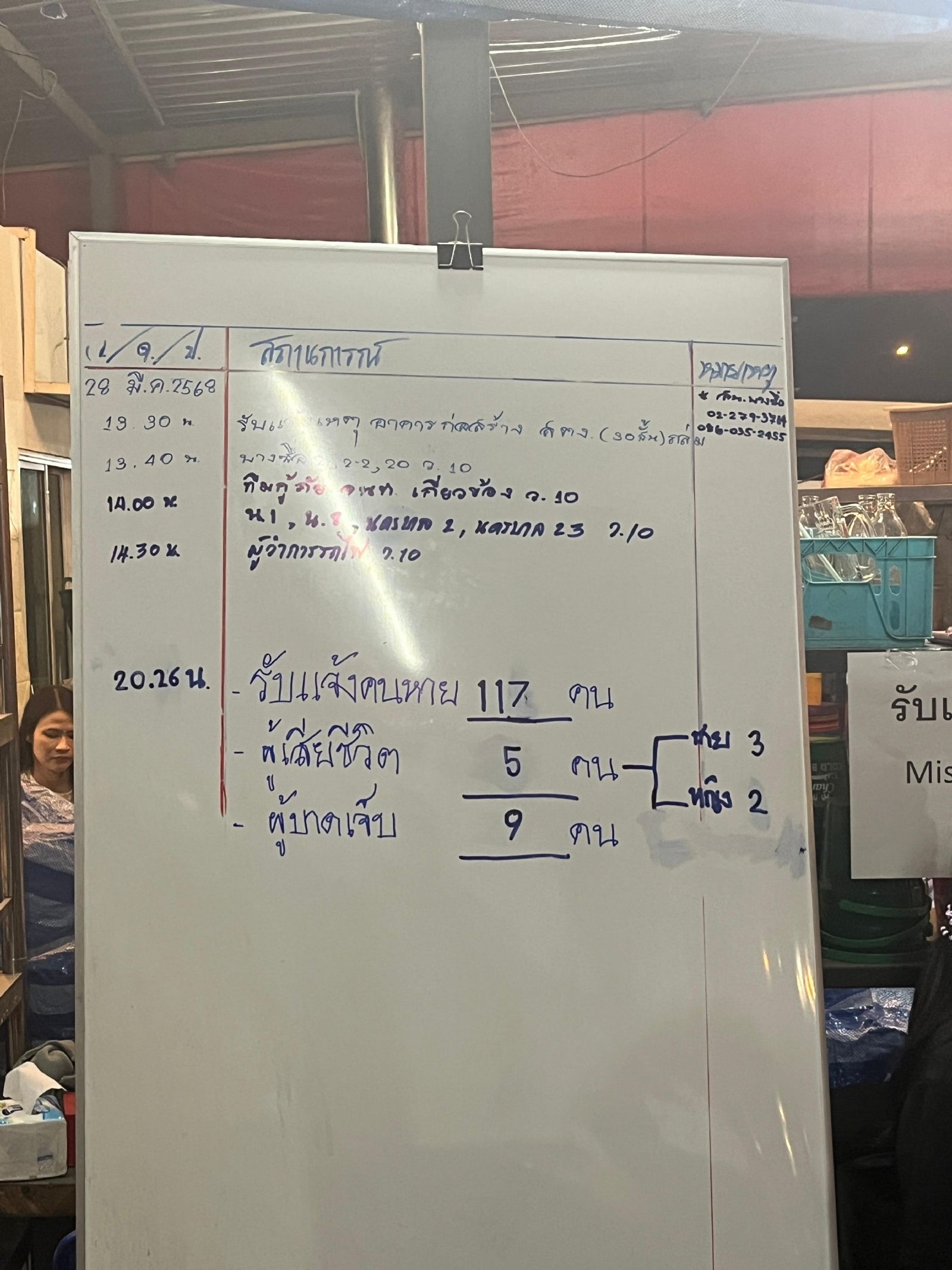 Cerca de las 21 (hora local en Bangkok) del viernes, alrededor de mil voluntarios llevan a cabo un operativo de rescate para buscar a las víctimas del derrumbe del edificio en Bangkok. Los efectivos tienen una pizarra en la que anotan el número de fallecidos, personas en estado crítico y desaparecidos. Hasta el momento, buscan a 117 personas desaparecidas bajo los escombros, en tanto que el número de muertos en el lugar ascendió a 5 (3 hombres 2 mujeres), mientras que 9 personas están en estado crítico.