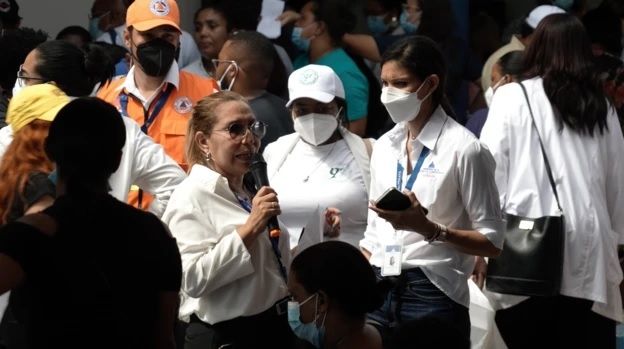 Con micrófono en mano, una trabajadora pregunta "¿dónde está el familiar de Viviana de Jesús García?, ¿el familiar de Ramón Teodoro Jiménez?, y así sigue leyendo la lista.