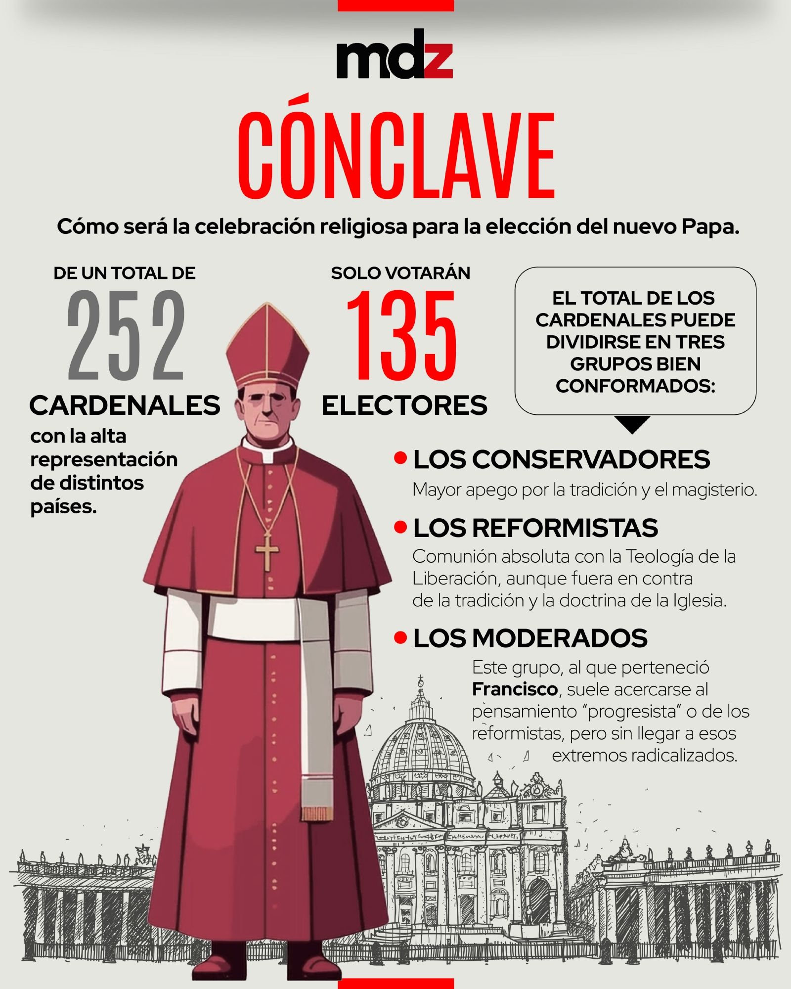 De los 252 cardenales que existen en el mundo, 135 son electores e integrarán el selecto grupo de clérigos que votarán por el próximo Papa. Dentro de todos estos hay dos grupos bien constituidos y los siempre llamados "indecisos" que terminan siendo los que definen la elección.
