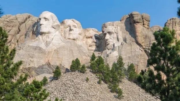 En el Monte Rushmore están talladas en piedra las caras de los fundadores de Estados Unidos: George Washington, Thomas Jefferson, Theodore Roosevelt y Abraham Lincoln. Foto: Getty Images