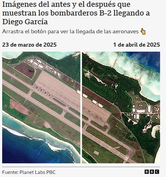 Imágenes satelitales analizadas por la BBC parecen mostrar bombarderos furtivos B-2 en la base de Diego García; estos se han utilizado en la campaña de bombardeos que Estados Unidos llevó a cabo recientemente contra combatientes hutíes en Yemen.