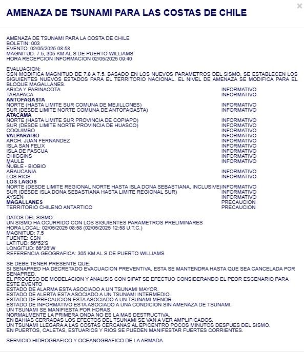La alerta fue emitida por el Servicio Hidrográfico y Oceanográfico de la Armada (SHOA), tras detectar la posibilidad de variaciones en el nivel del mar. El epicentro fue ubicado a más de 200 kilómetros al sur de Puerto Williams y a una profundidad de 10 kilómetros, según datos del Centro Sismológico Nacional. El sismo se sintió con fuerza en el área, generando preocupación entre la población.