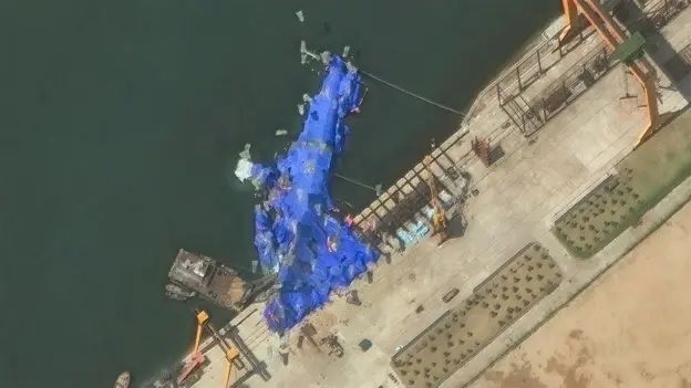 En esta imagen satelital se ve el buque de guerra volcado, cubierto por grandes lonas azules. Una parte del buque parece estar en tierra. Foto: Maxar