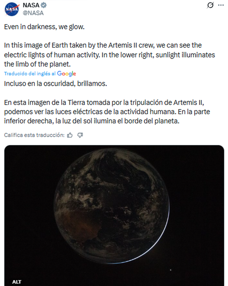 "¡Buenos días, mundo! Tenemos nuevas y espectaculares imágenes de alta resolución de nuestro planeta natal, donde todos miramos a través de la ventana de la cápsula Orión a nuestros astronautas de Artemis II mientras continúan su viaje a la Luna", fue el primer posteo que compartió la NASA en su cuenta de X.